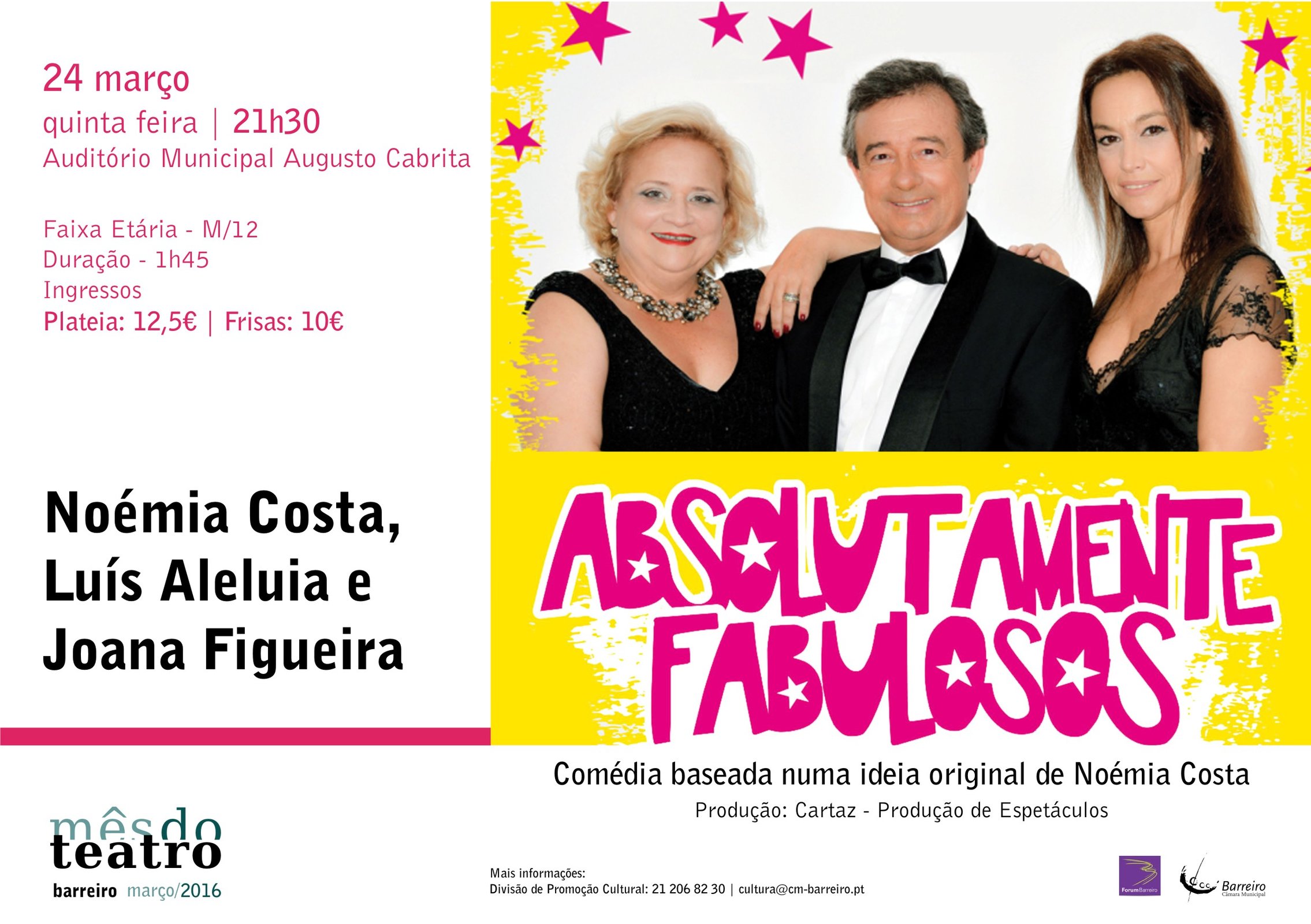 No âmbito do Mês do Teatro, o Auditório Municipal Augusto Cabrita recebe, no dia 24 de março (quinta-feira), pelas 21h30 a comédia “Absolutamente Fabulosos”.