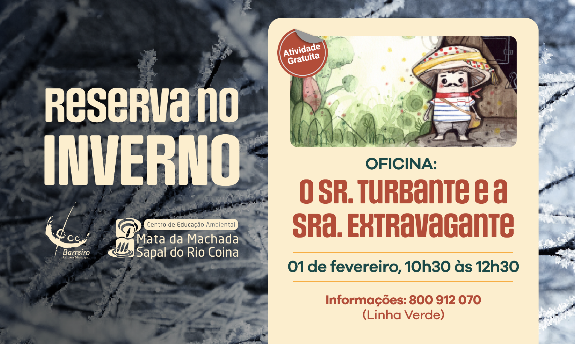 Estão já a decorrer as inscrições para a ação “O Sr. Turbante e a Sra. Extravagante”, no dia 1 de fevereiro, entre as 10h30 e as 12h30, no CEACentro de Educação Ambiental da Mata Nacional da Machada e... – Centro de Educação Ambiental da Mata da Machada. Nesta manhã faremos o lançamento do livro “O Sr. do Turbante e a Sra. Extravagante”, uma história em que o universo de alimentos – que falam, querem viajar e experimentar restaurantes – se cruza com emoções e vontades humanas, como a esperança, a tristeza, a incredulidade e o humor, e no qual a paixão surge de forma inusitada. Depois de uma animada conversa, segue-se uma oficina de expressão plástica, relacionada com a história.